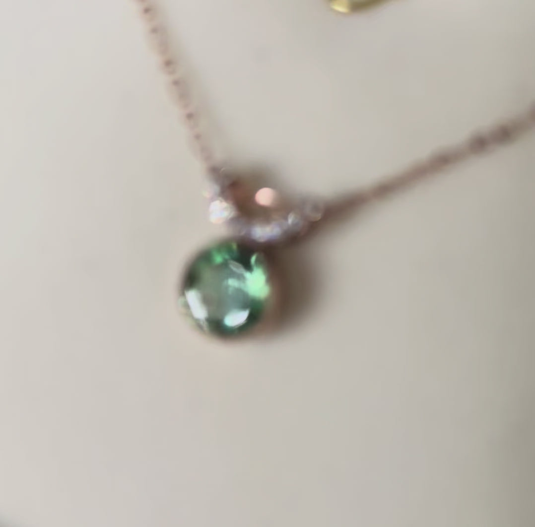 This gorgeous pendant features an 8mm lab grown Mint Green Sapphire, set in 14kt Rose Gold, with a 1/8 ctw lab grown diamond bail on an 18in figaro chain.
